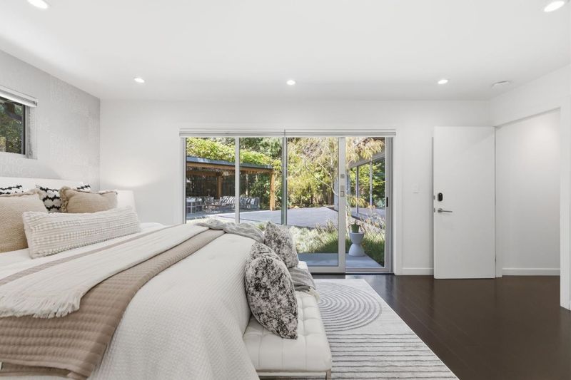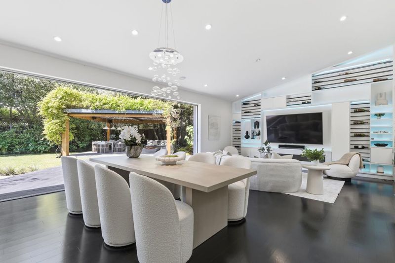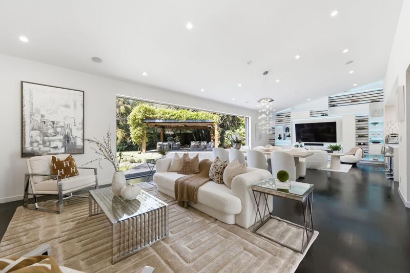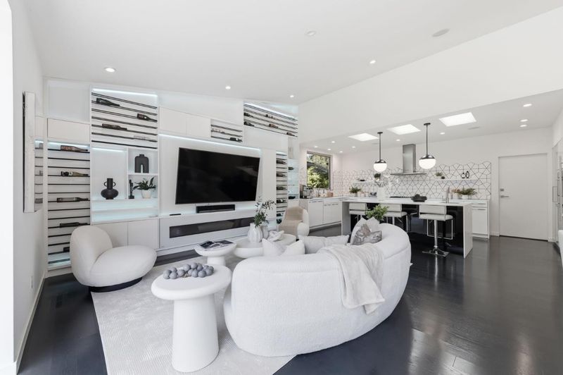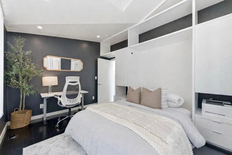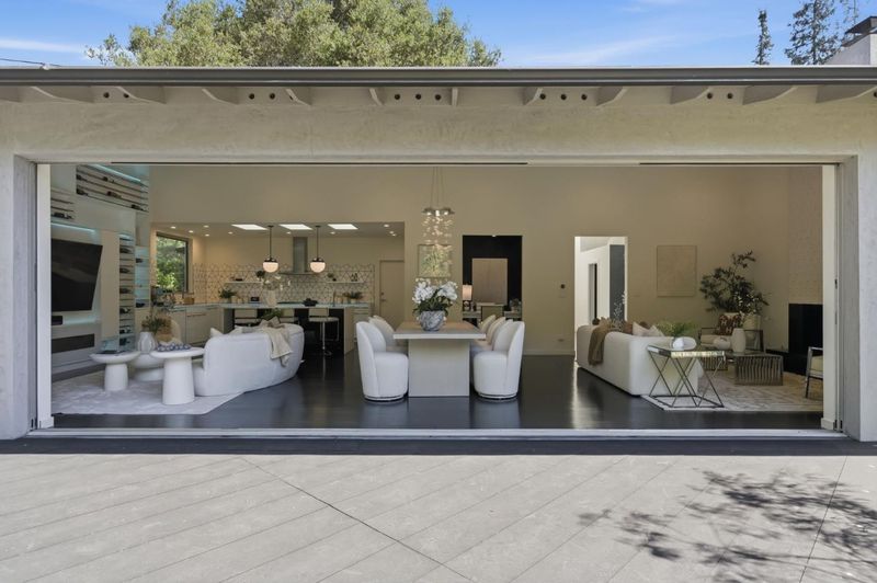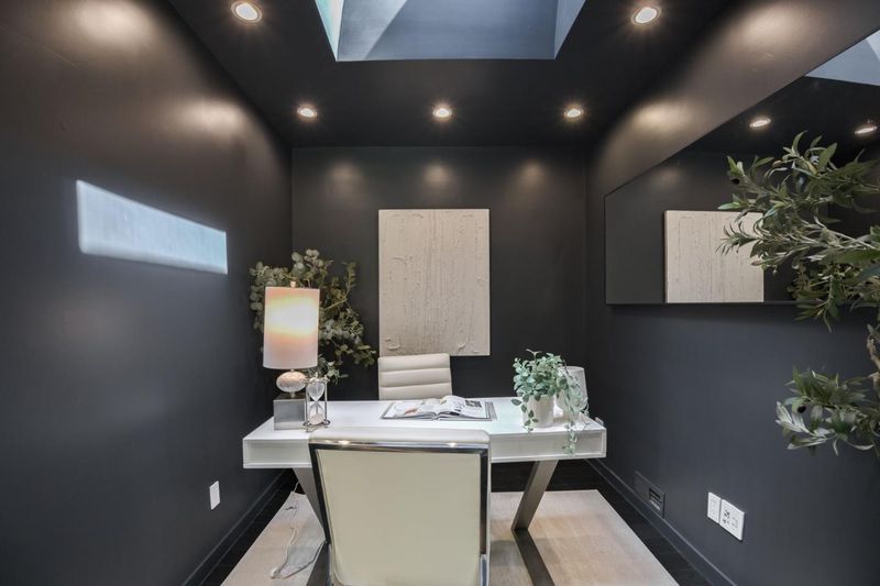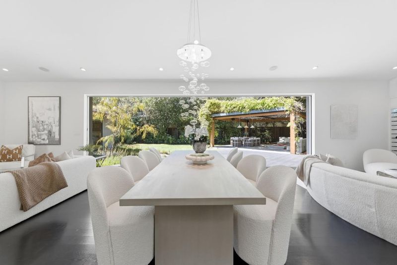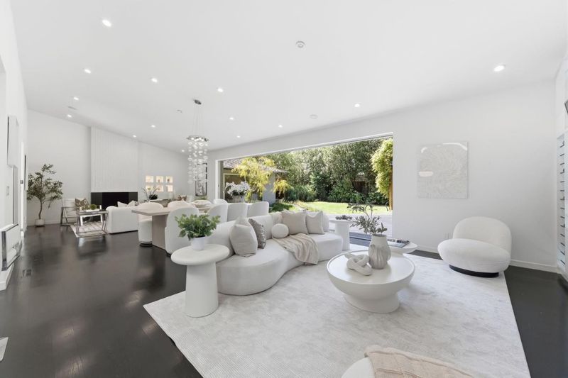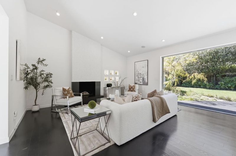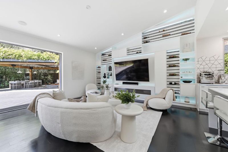 This exceptional Crescent Park home, blocks away from DownTown, pairs striking contemporary architecture with visually sophisticated, livable interiors. A glazed foyer and vivid front door, introducing lofty, light-filled spaces, leading to a spacious mudroom and a library-lined hall. The main office offers high ceilings, large window facing sculptural front yard & Murphy bed for guests. The great room boasts a fireplace wall w/ custom display niches, centers on a built-in media and wine display wall and opens through expansive retracting glass doors to the backyard. The sleek kitchen offers multiple skylights, custom cabinetry, oversized island & top of the line appliances. Beautiful dark hardwood floor throughout. Additional office off of the great rm. The spacious primary suite w/ sliding doors leads to the backyard. Spa-like bath with dual vanity, mosaic detailing, skylit ceiling & oversized glass shower w/ side jets. Three additional bedrms are each distinct and expressive, two baths finished with a designers eye for material. Fully outfitted gym, large laundry rm. Outside, the stunning pergola features a fire pit, built-in cement seatings w/ suspended lighting. In-ground lighting traces the deck. The backyard features wooden spa structure, kids playhouse and a trampoline.