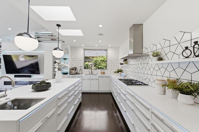 - Countertop - Quartz, Dishwasher, Freezer, Garbage Disposal, Island with Sink, Microwave, Oven - Built-In, Oven Range - Gas, Pantry, Refrigerator, Skylight, Trash Compactor