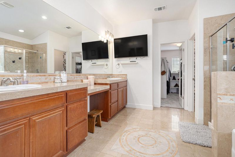 - Double Sinks, Primary - Oversized Tub, Primary - Stall Shower(s), Primary - Tub with Jets, Split Bath, Stall Shower, Tile, Tubs - 2+