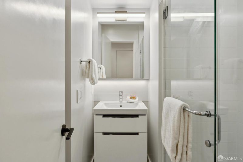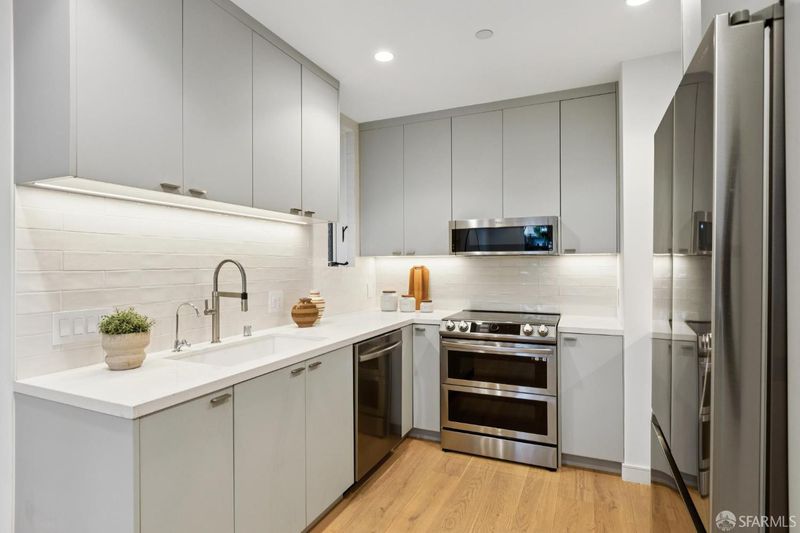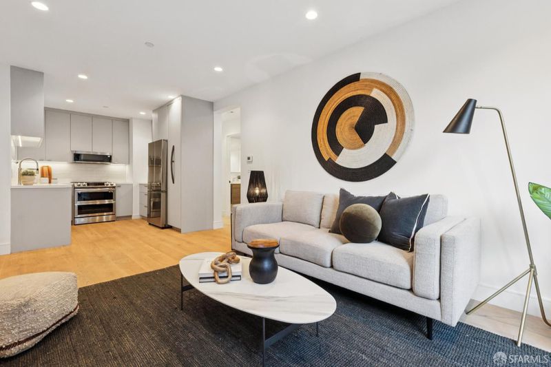 Saturday Open: 1155 Fell Street is a new construction garden- level condominium in a newly created boutique three-unit association. Enter through a private walkway flanked by architectural stone walls, arriving at a glass entry door into a clean single-level interior. Open-plan living and dining, a fully updated kitchen with sage-gray cabinetry, subway tile backsplash, quartz countertops, and stainless steel appliances. A primary bedroom on the rear faces the private deck and one other bedroom. towards the front of the home allows maximum privacy. A dedicated study adds flex space for a home office, storage or creative space. Two full baths. Sliding glass doors connect the living room directly to the deck, where full outdoor dining and lounge seating faces a tree canopy. It's truly an unexpected and unique, one-of-a-kind home in the vibrant NOPA neighborhood. The building’s infrastructure is the same throughout: new 400-amp electrical service, new windows, and a seismically upgraded structure. In unit laundry.