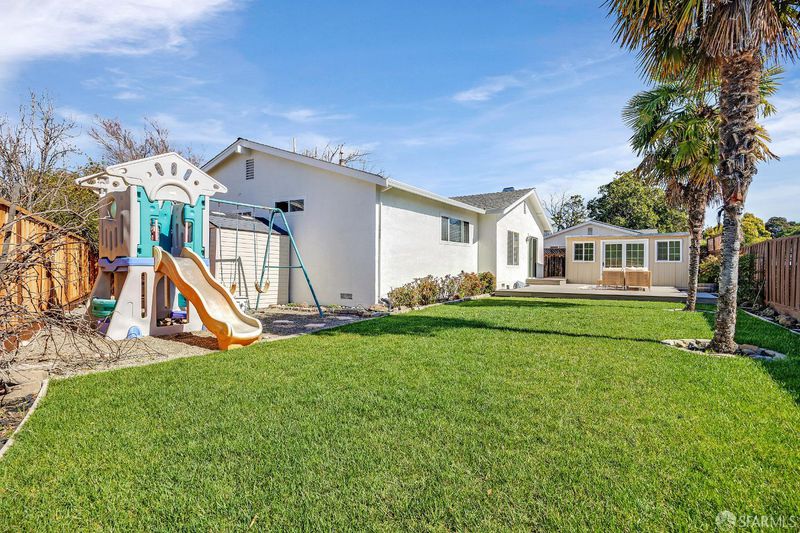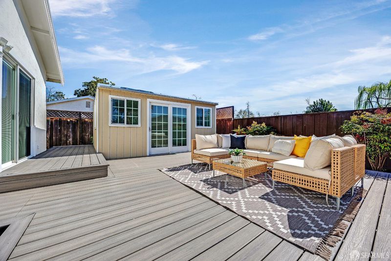 Charming Pleasanton single-story on a quiet court featuring a resort-style backyard, custom deck, and brand-new roof (2026). This well-maintained 3-bedroom, 2-bath home offers approximately 1,434 sq ft of living space on a 6,731 sq ft lot. The inviting backyard is designed for California indoor-outdoor living, featuring a custom composite deck (2021), lawn area, mature landscaping, and palm trees that create a relaxing retreat. A detached backyard storage shed with French doors and windows (2021) provides versatile space for additional storage, hobbies, or a workplace. The yard also includes a play structure and space for outdoor entertaining. Recent improvements include fresh interior and exterior paint (2026), new water heater and kitchen appliances (2022), and a full HVAC replacement with new ducts and upgraded attic insulation (2019). Additional features include a whole-house water softener, kitchen water filtration system, and updated backyard fencing. Conveniently located near top-rated Pleasanton schools, Val Vista Park, Stoneridge Shopping Center, Costco, dining, BART, and easy access to I-680. A wonderful opportunity to enjoy comfort, convenience, and Pleasanton lifestyle in a beautifully maintained home.
