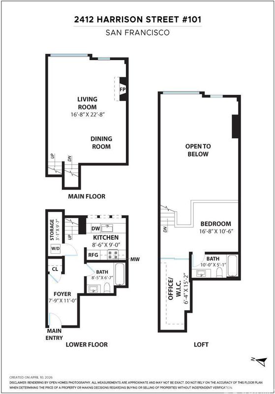 Stylish and contemporary loft residence in the heart of the Inner Mission, offering impressive volume, versatility, and modern convenience. This thoughtfully designed one-bedroom, two- bathroom home features a lofted sleeping level with an expansive walk-in closet that easily functions as a home office, complete with an ensuite bath. The main level presents an open living and dining area with hardwood flooring, a gas fireplace, and oversized windows that bring in abundant natural light. A sleek galley kitchen is equipped with quartz countertops, stainless steel appliances, including a gas range and dishwasher, and excellent storage. A full bathroom with porcelain tile and shower over tub, along with in-unit stacked laundry, completes the picture. Additional highlights include high speed Webpass internet included in the HOA, two-car parking with EV charging, video intercom, secure lobby with package area, bike storage, elevator, and a sprawling shared roof deck with city views. Professionally managed HOA with strong reserves. Ideally located across from Flour + Water and just moments to the vibrant 20th Street corridor, with popular dining, shopping and gyms. 98 Walk Score and 99 Bike Score, plus easy access to freeways and tech shuttles. A true urban sanctuary with exceptional live/work flexibility.